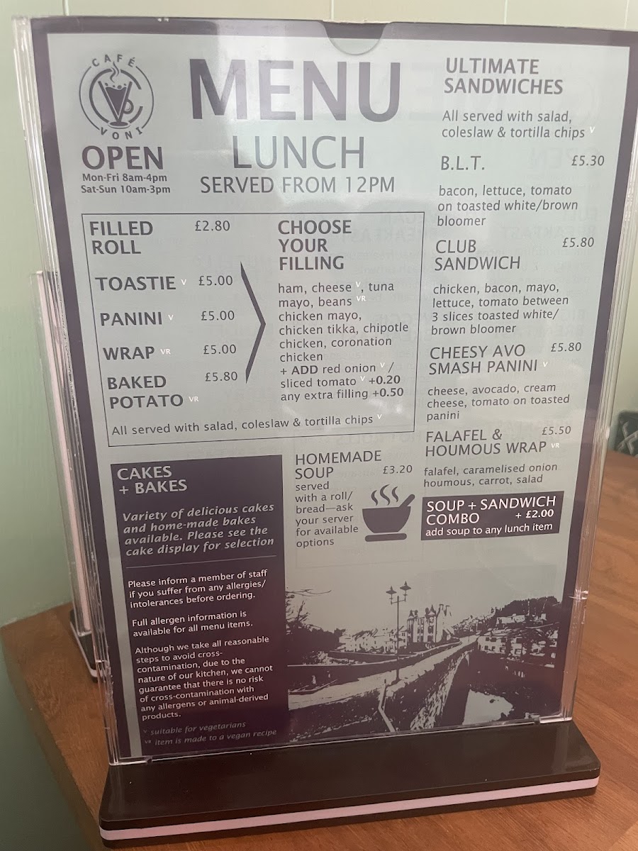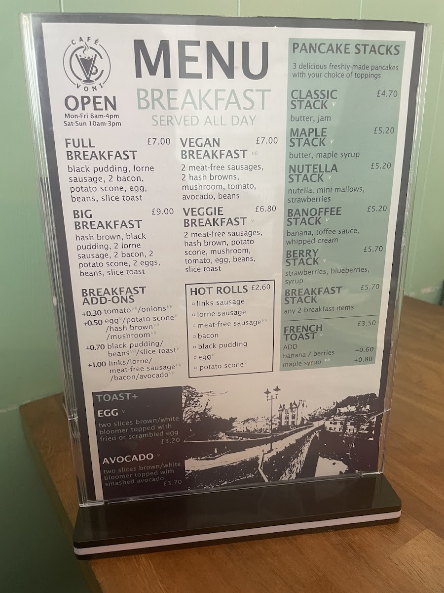 The menu is structured to accommodate different meal times and preferences, offering both hearty breakfast plates and lighter snacks alongside hot drinks. Visitors can use the menu for casual dining in or takeaway options.