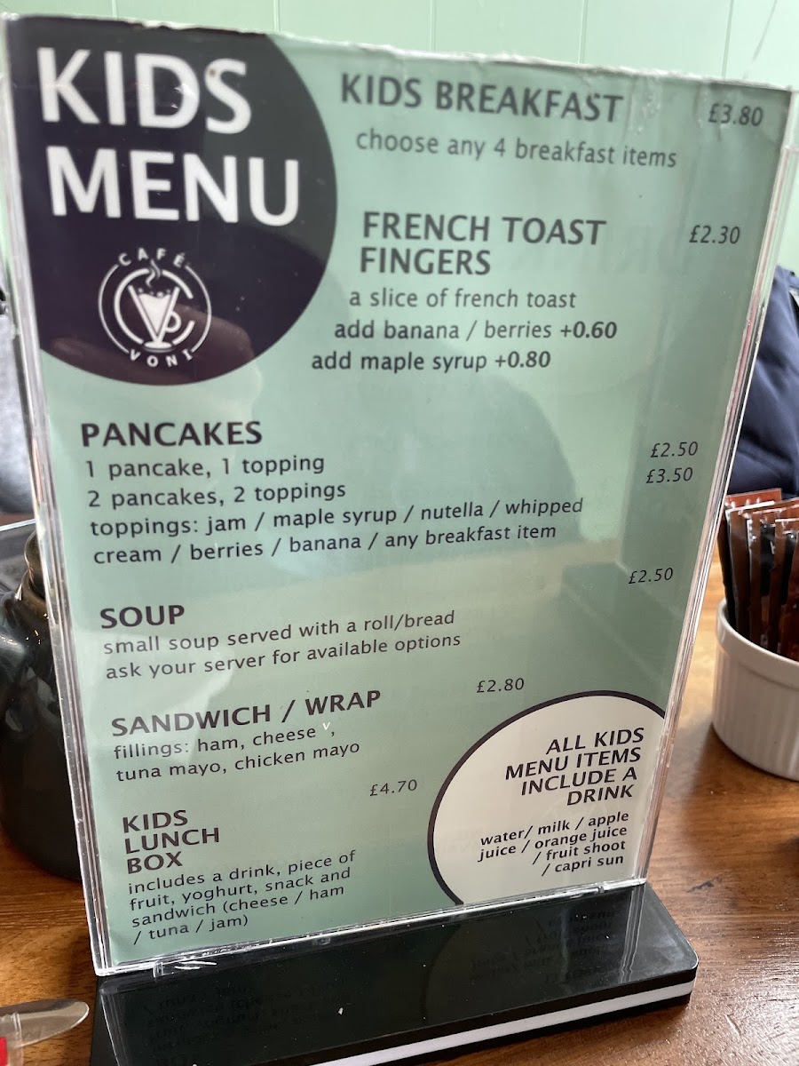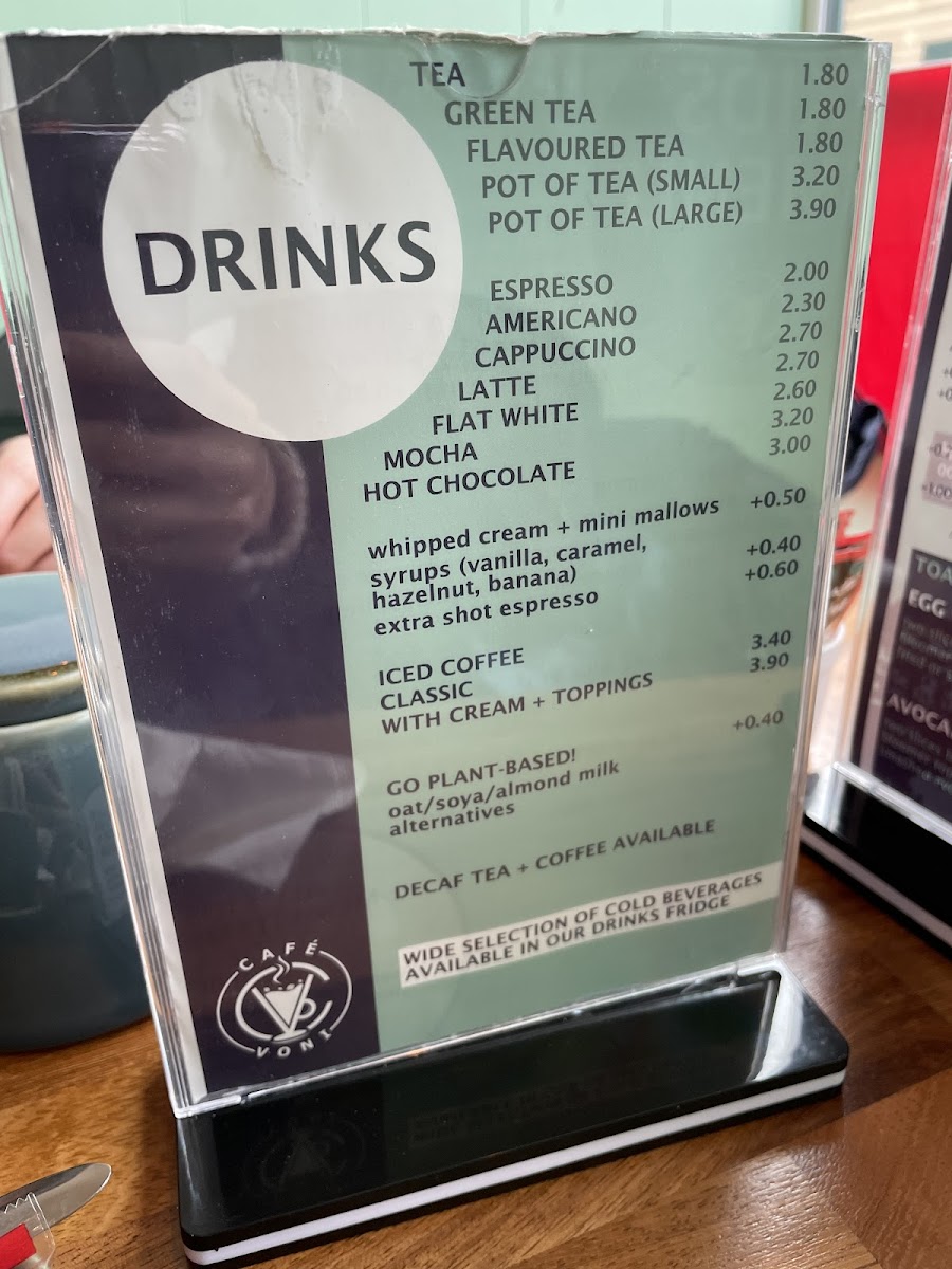Sandwiches, wraps, and a kids lunch box are also available, catering to those seeking quick light meals. The drink selection includes a variety of hot beverages such as espresso-based coffees (Espresso, Americano, Cappuccino, Latte, Flat White, Mocha), hot chocolate, and different types of tea including Green Tea and Flavoured Tea. Pastries and other baked items are implied by customer comments but are not detailed on the menu.
